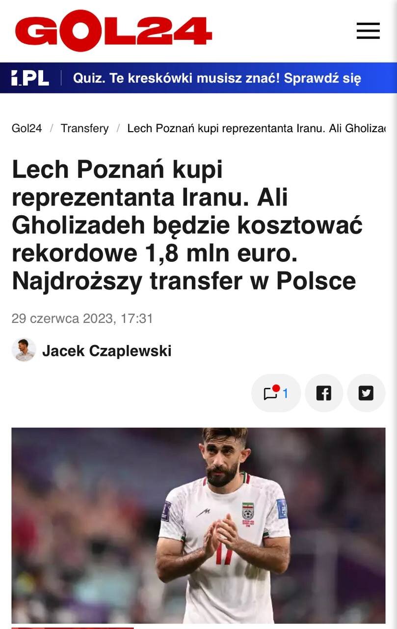 رسانه gol24 لهستان در مطلبی نوشته است: لخ پوزنان بازیکن ملی پوش ایرانی را میخرد. علی قلی زاده برای این انتقال، 1.8 میلیون یورو هزینه خواهد داشت، گرانترین انتقال در لهستان.